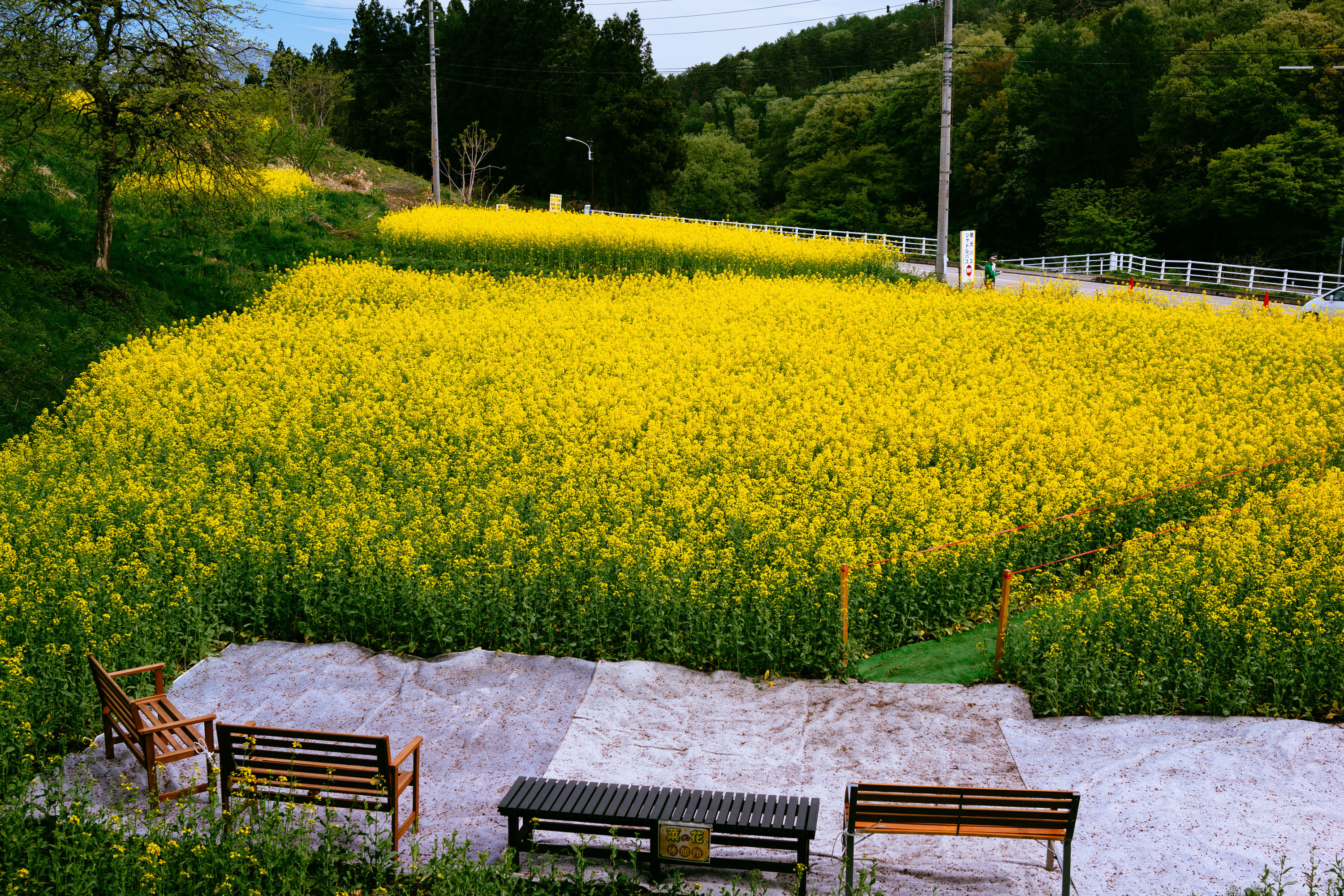 まずは朝イチで出発して関越道を北上。ポスターをみて前から気になっていた飯山の菜の花祭りへ行ってみることにした。菜の花なんてどこにでも咲いているものじゃないかって話ではあるが、圧倒的な量でまるで黄色い海にいるかのような風景は夢のなかのようだった。