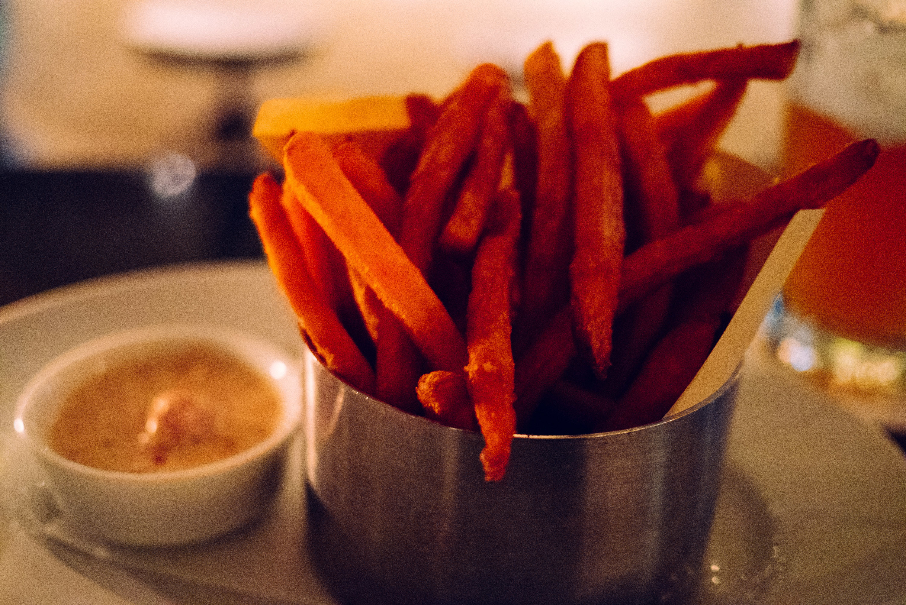 食事については、とくに考えていなかったのだけど、つまみぐらいはあってもいいかなと思って頼んでみた。フライドポテトかなと思っていたのだが、スウィートフライドポテトというメニューがあり、これなんだろうと訊いてみたら、サツマイモで作ったフライドポテトをメープルシロップとベーコンのディップでいただくというもの。