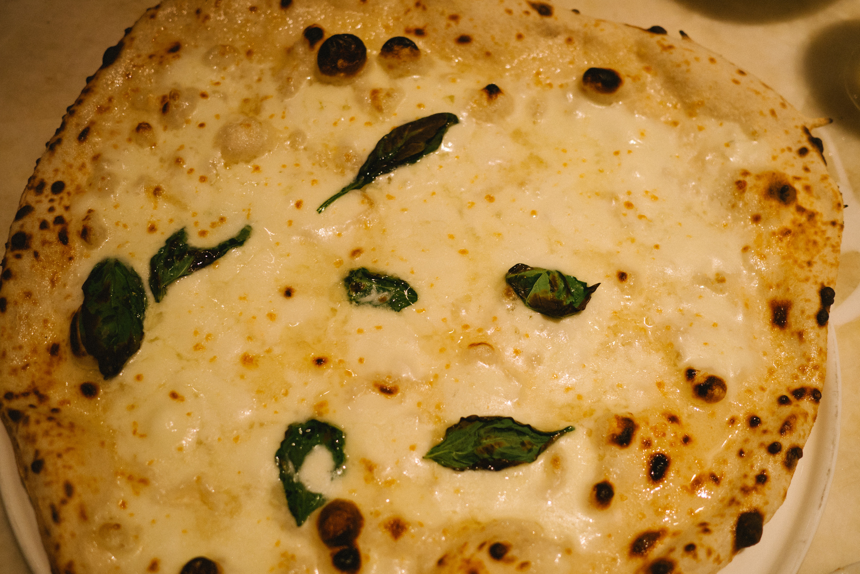 いつもだいたい、ワイン頼んで単品のつまみみたいなのを食べながらピザを待つ感じ。ピザについてはマルゲリータがいいけれど、もう一枚頼むとしたらって考えていたのだが、店員さんに本店でも提供している「マリゲリータ・ビアンカ」というものがあるって教えてもらい試してみることに。