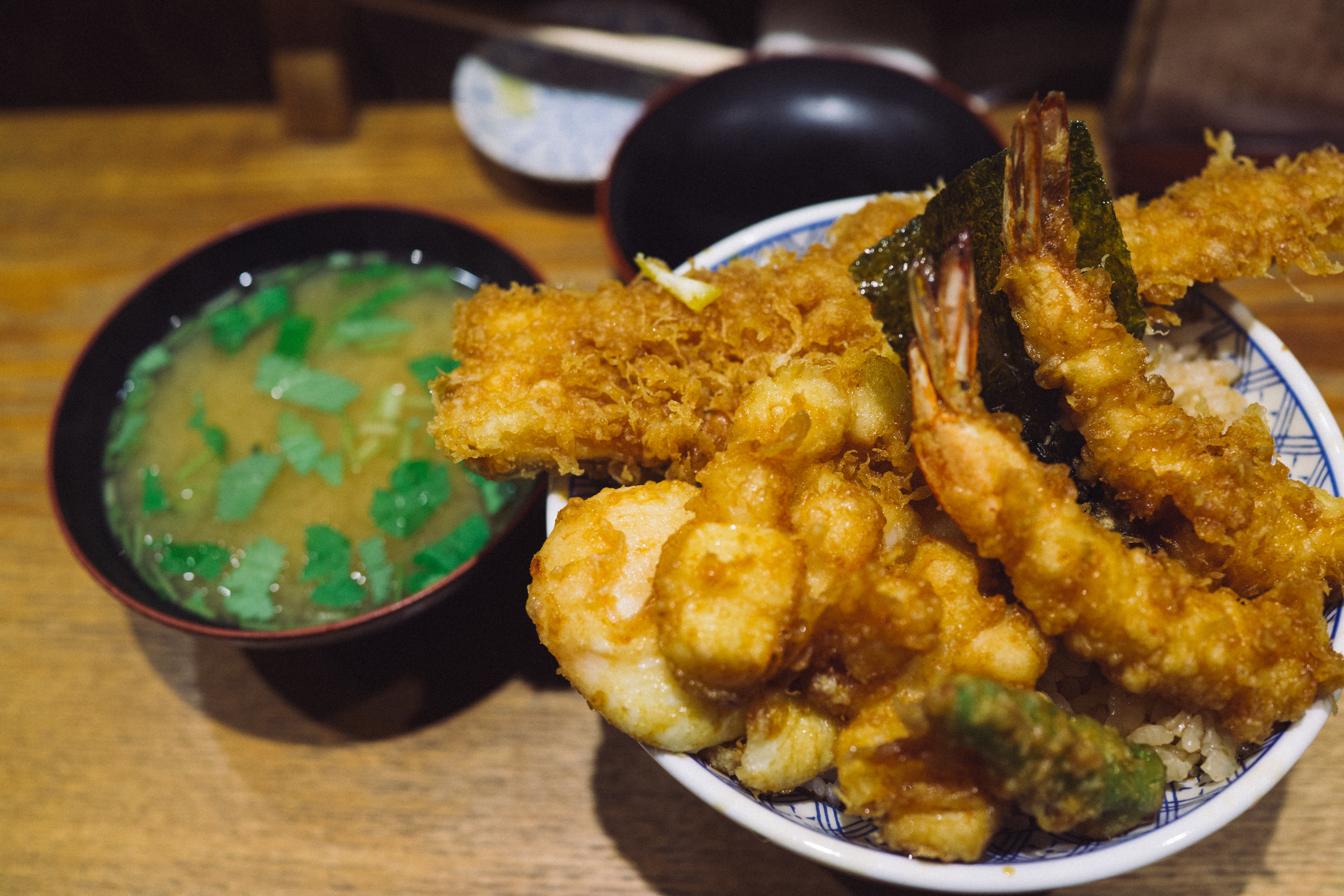 そしていよいよ天丼の登場。巨大な穴子、海老、イカ、半熟卵、ししとう、ホタテなどを盛り付けているのだけど、これがごはんが見えないくらいにこれでもかと豪快にのっている。穴子はキスに変更できるとのこと。海老とかは当然のごとく美味しいのだが、一番感動したのはホタテ。貝柱をまとめて天ぷらにしていて、これがまた旨みがあって美味しい。
