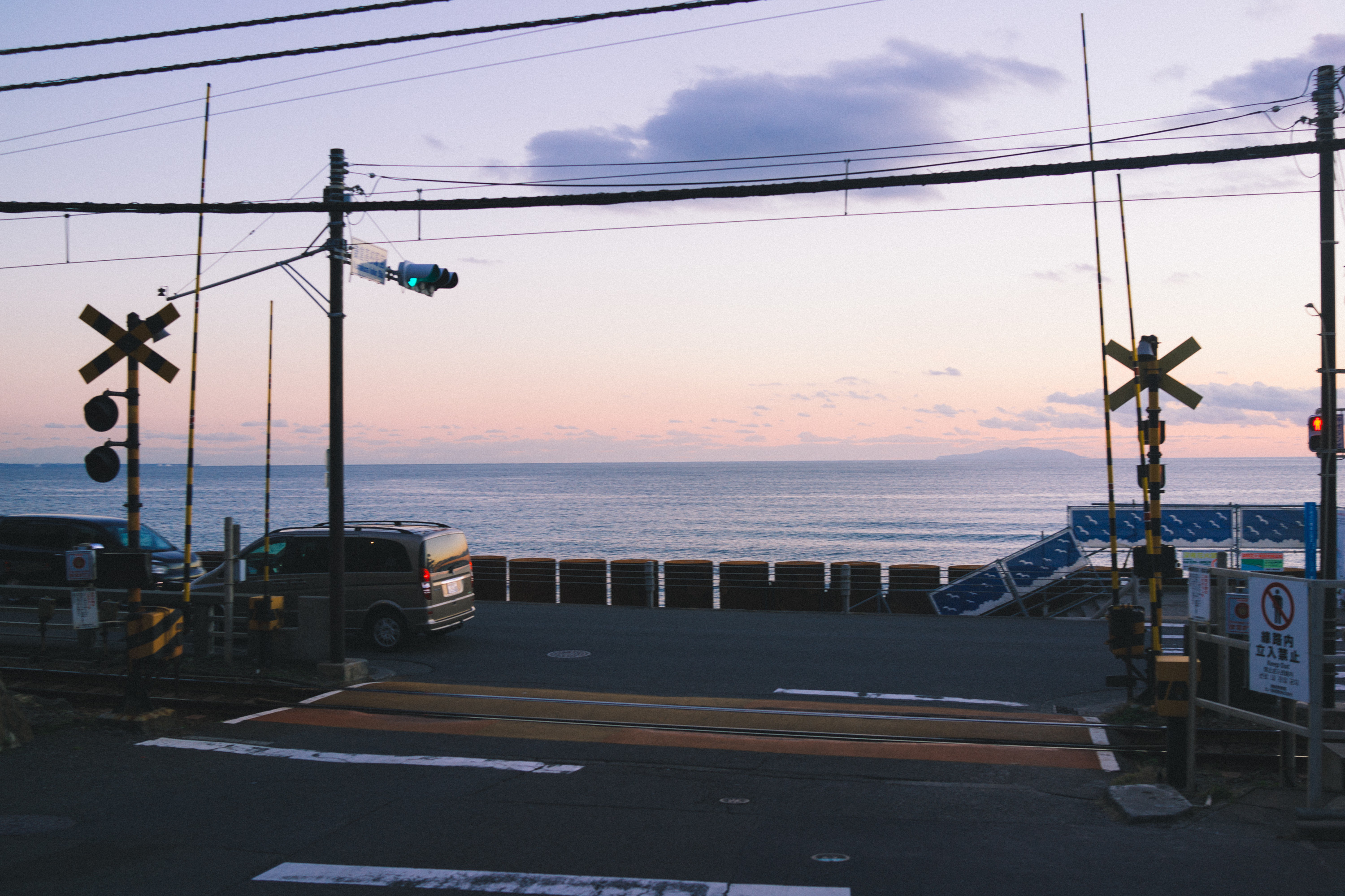 江ノ電は稲村ヶ崎~鎌倉高校あたりは相模湾に沿って走るので外の風景がすごく美しい。夕暮れ時に乗ったのだが、江ノ島の向こうに沈む夕陽の色は幻想的な感じすらした。こんなにも美しい風景だなんて、ちょっとこの街に住みたいなと思ってしまうくらいだ。単線のため、行き違いの停車がこんなにもうれしい場所なんてそうそうない。