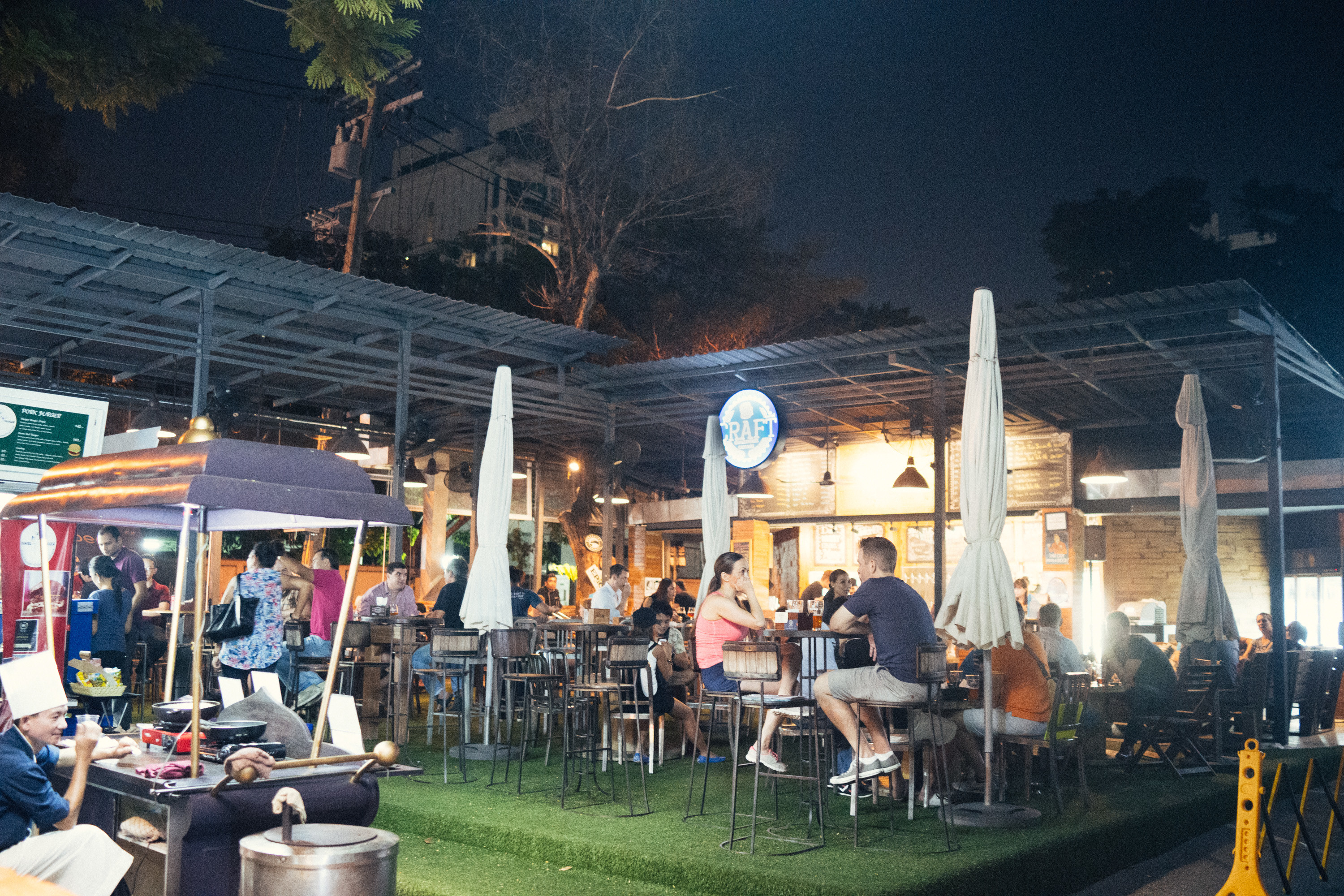 Craft Bangkok はスクンビット通りからちょっと裏通りを行ったあたり、悪名高きSoi Cowboyを通り過ぎた先にある。オープンエアのフードコートみたいな感じで、CRAFTの他にもいくつかお店が集まっている。なので、ビールはここ、食事はあっちみたいな楽しみ方ができるので楽しそう。