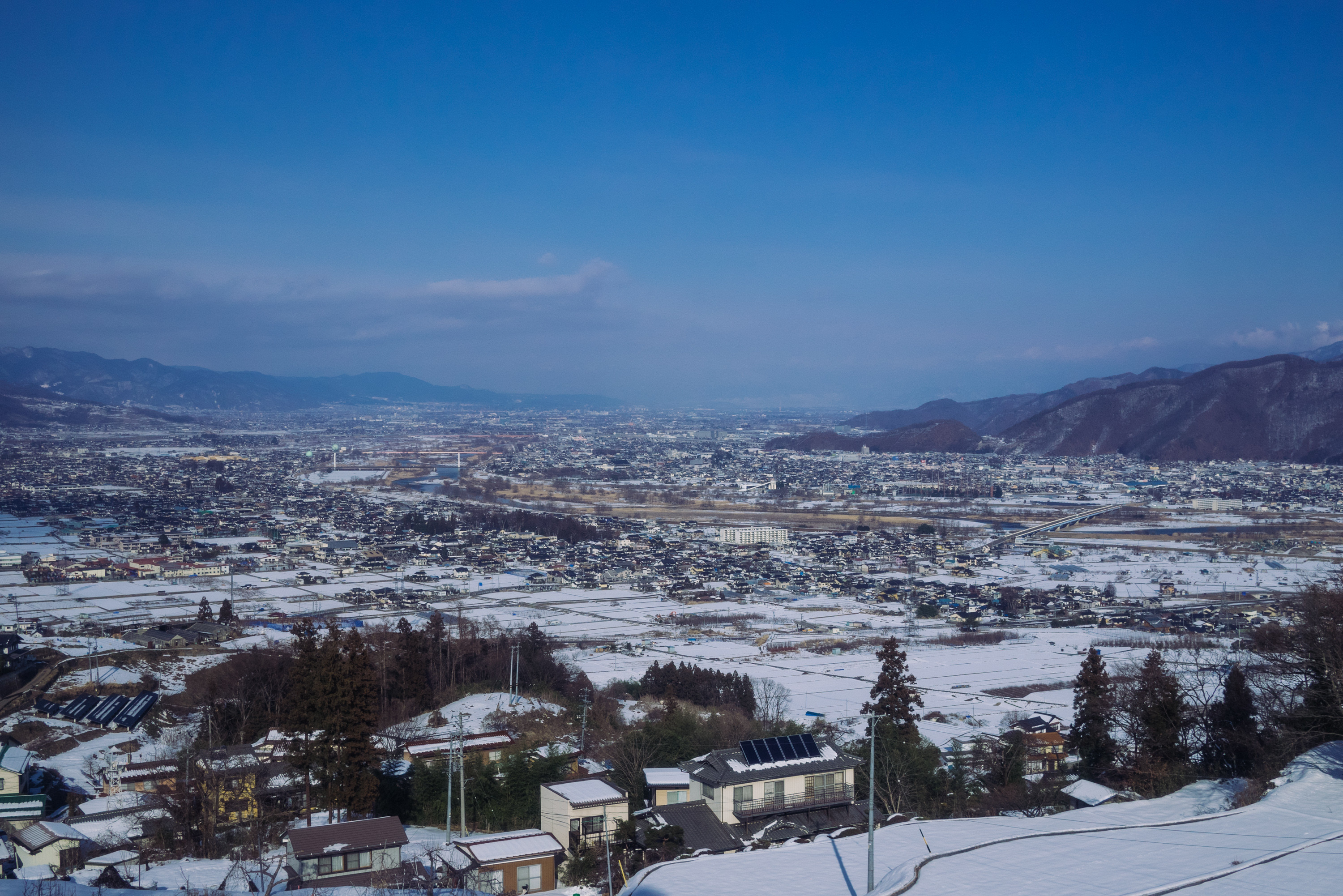 乗ってみて知ったのだが、松本と長野の間の路線は日本三大車窓ということで、姨捨駅からみえる善光寺平の風景はまさに絶景。雪景色に覆われた長野の盆地の風景がひろがっている。この景色をみただけでも、この旅に来てよかったなと思える。