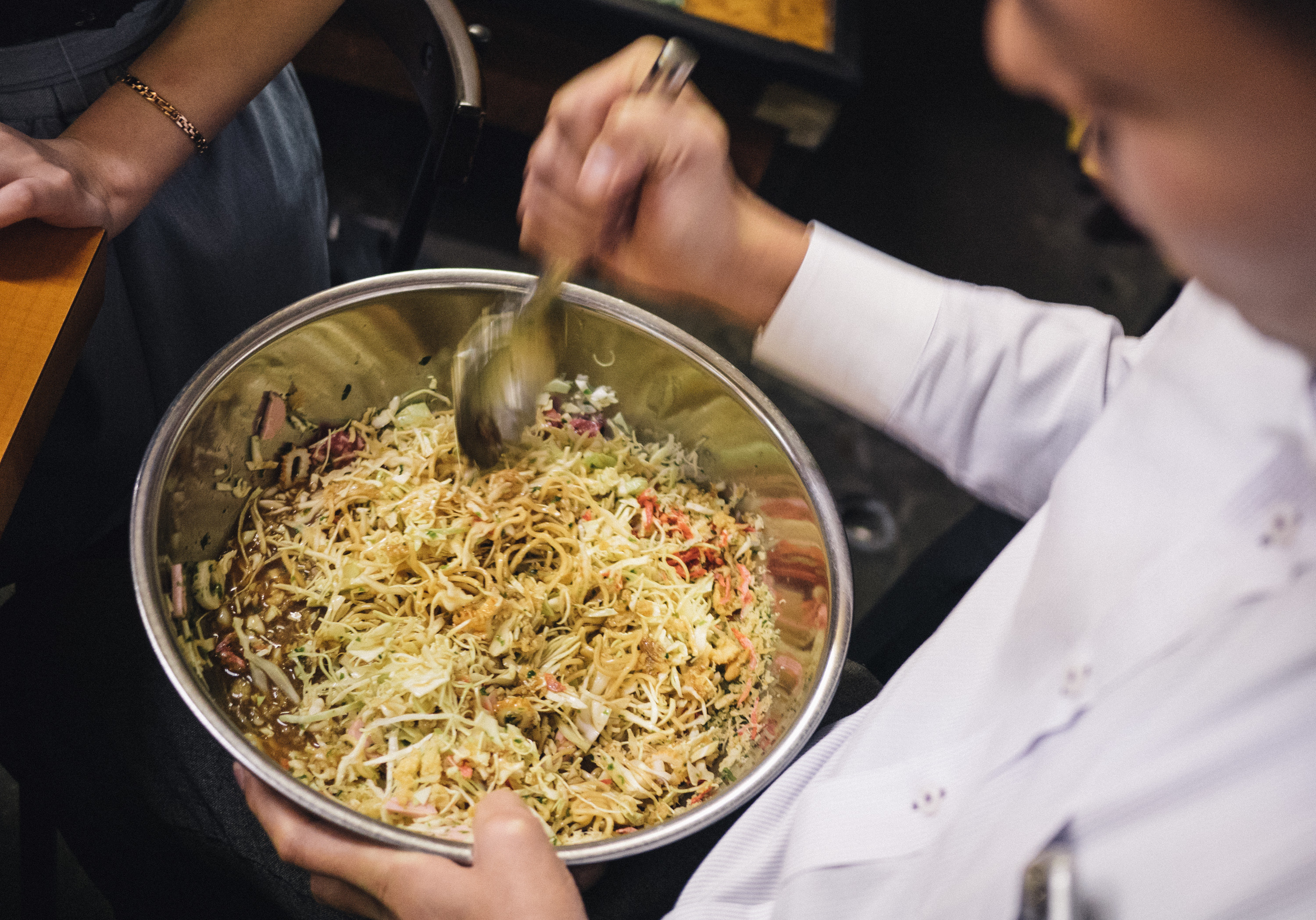 重要な教訓(その2):「決して、ヘラでボールを叩くようにもんじゃを混ぜないこと」。
