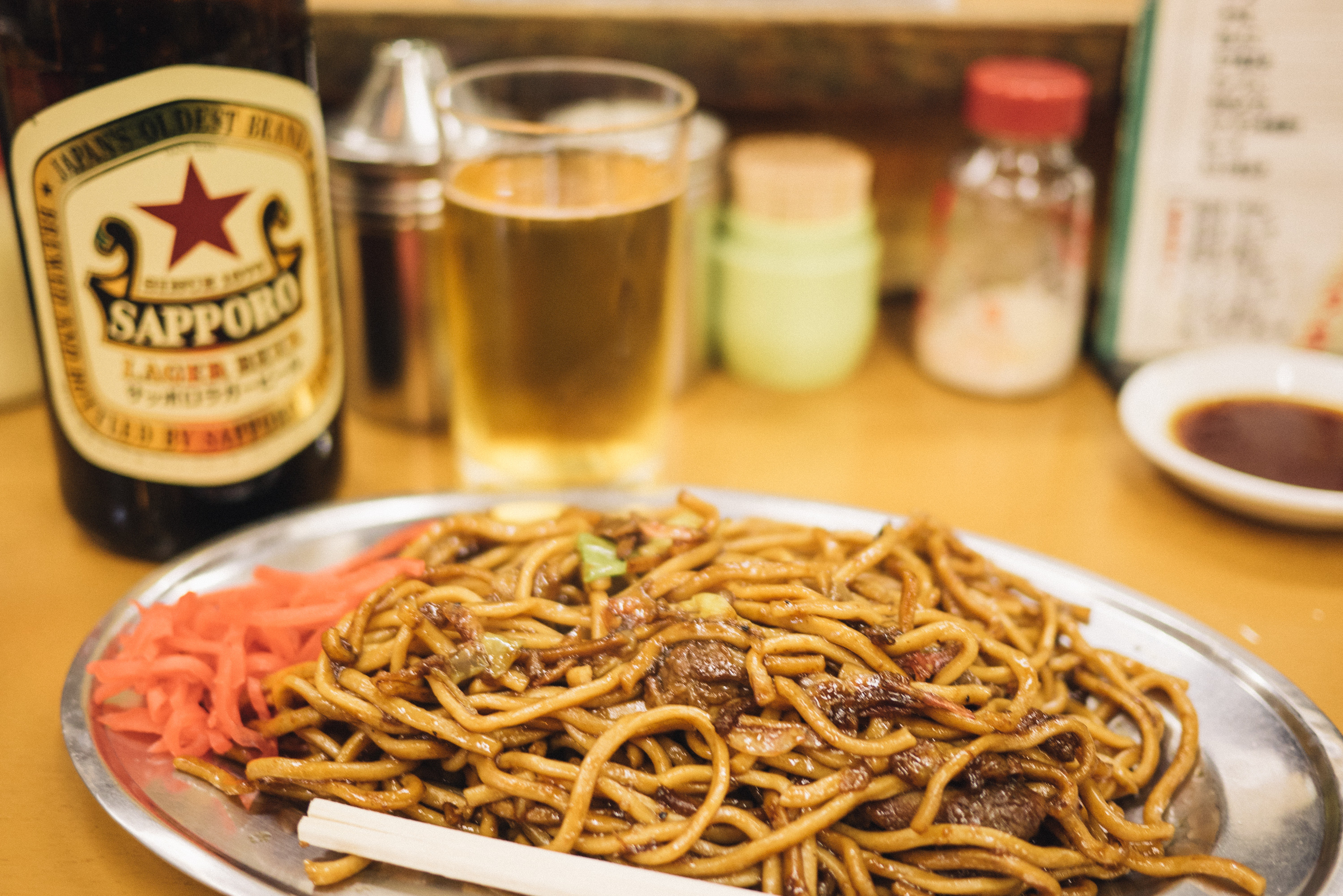 焼きそばが350円くらいであるのだが、僕は贅沢にもおすすめされた牛すじ焼きそば500円をオーダー、そして餃子と瓶ビールを頼む。昼間に行ったのだが、なんかビール飲みたい気分だったので。というか、ここの料理の味付けはビールによく合うと思うから仕方がない。