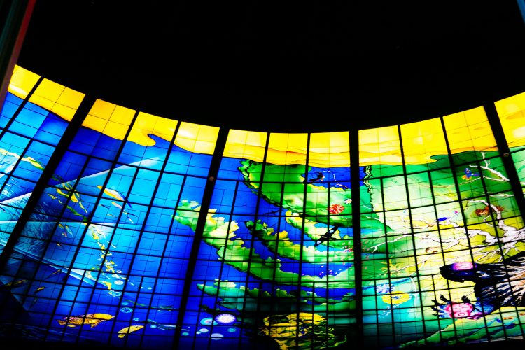 このステンドグラスは直径30メートルもあり、イタリア人の芸術家が四年以上の歳月をかけて作り上げた作品。水・土・光・火がテーマに描かれている。何の気なしに地下鉄駅を乗り換えるときにちょっと見ておくかと行ってみたのだが、これは来てよかったなと思えるところだった。