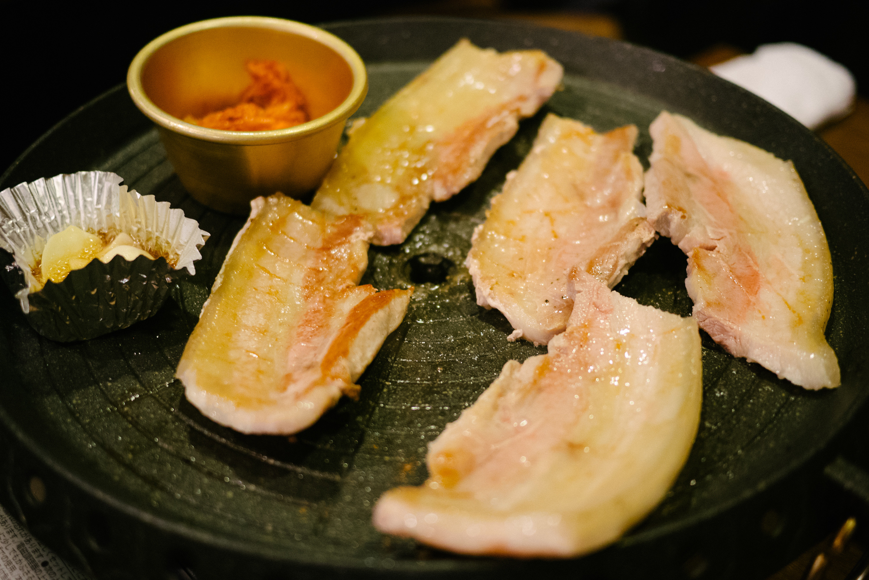 サムギョプサルは分厚い豚バラ肉を焼いていて、鉄板の端から流れ出てくる脂身の量を考えるとすごいのだが、この旨みが野菜とあって美味しい。