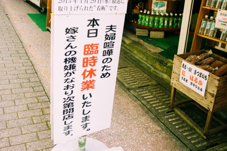 数軒並ぶお土産物屋さんはどれも違いがあまりないのだが、一軒の店の看板に「夫婦げんかしたから本日は臨時休業」と書いてある。どいつもこいつもふざけたこと書きやがって・・と思うのだが、こういうところも昭和っぽい余白があるユルさだよなって思う。いまなら、なにか書こうにもまず「それは不謹慎かどうか」から考えなきゃいけない気がする。