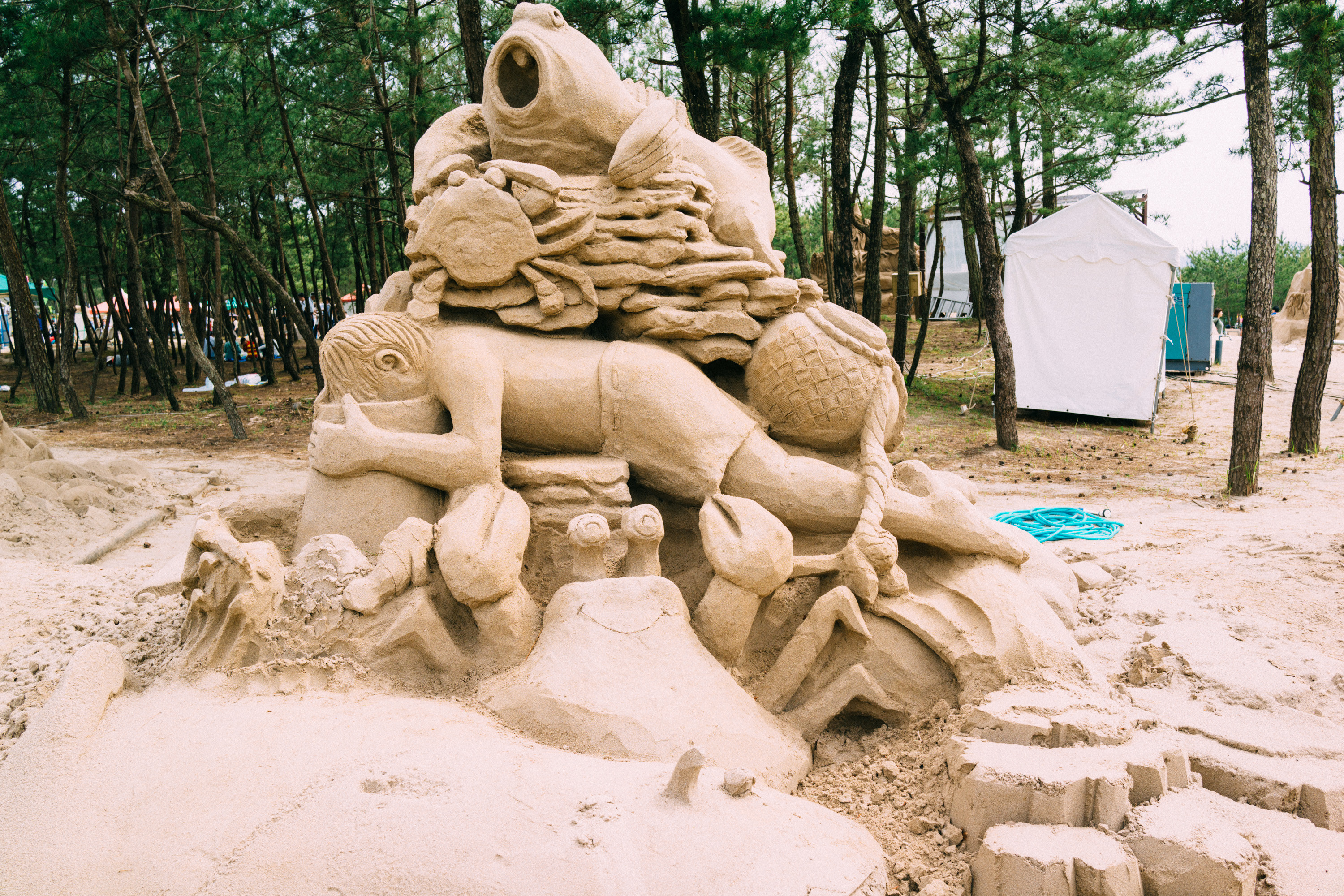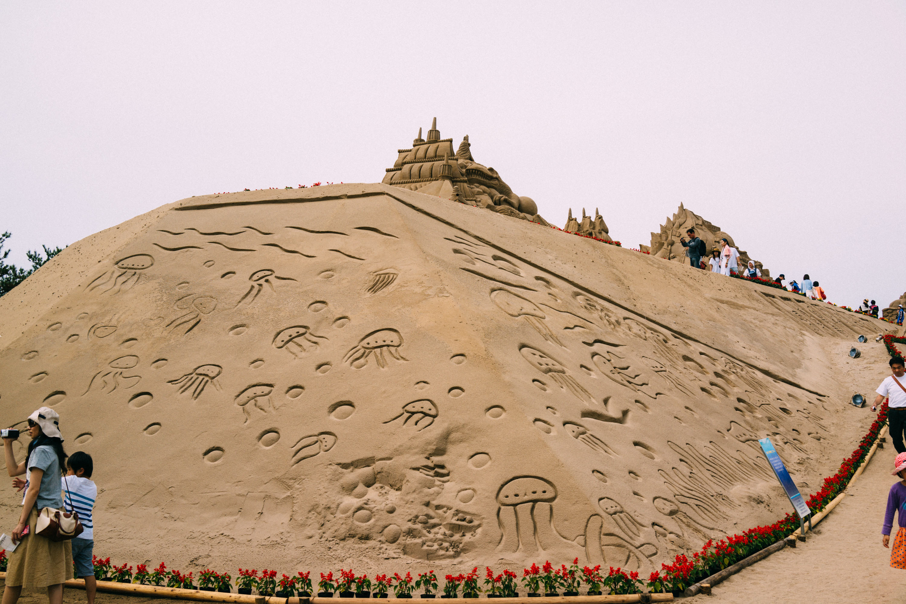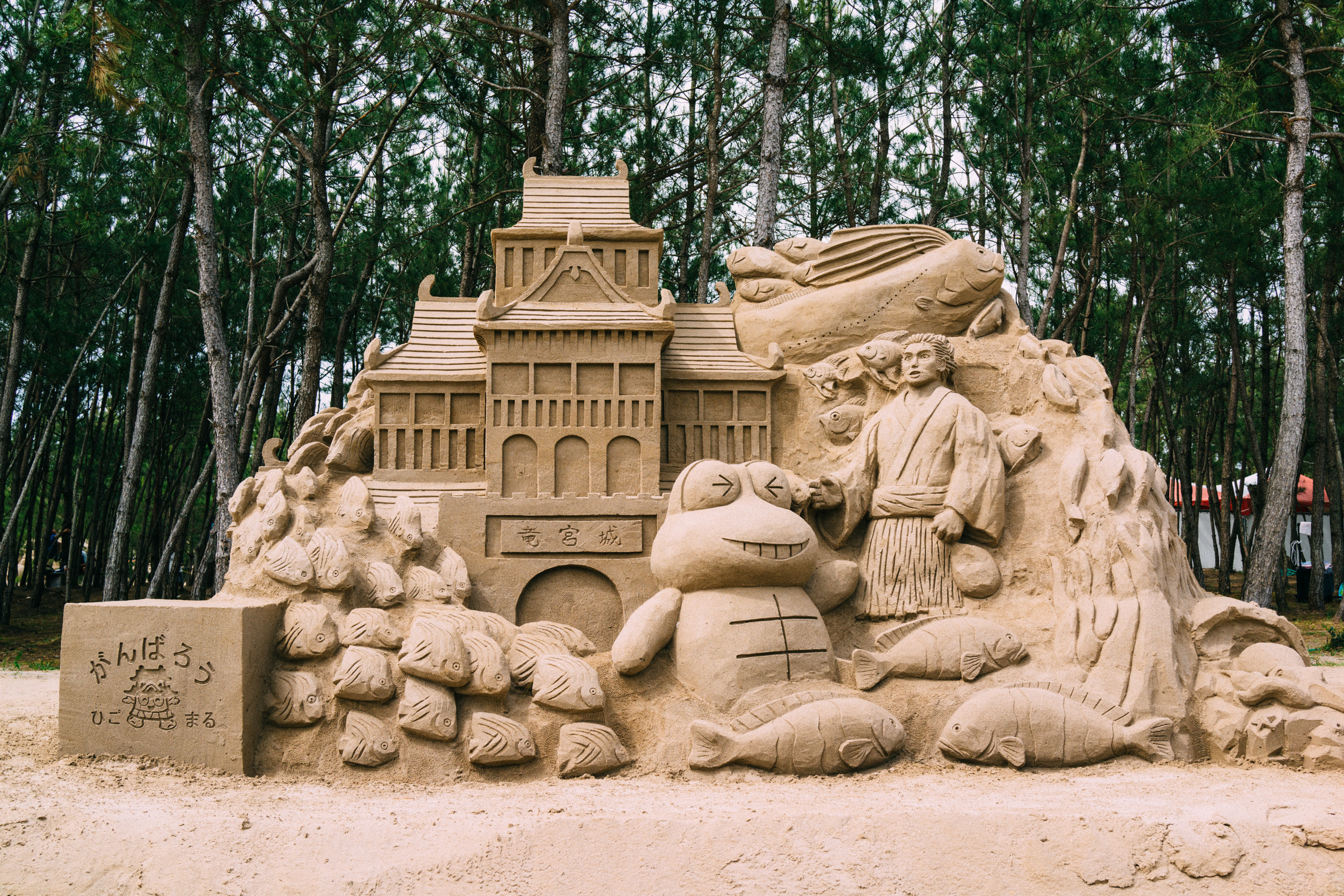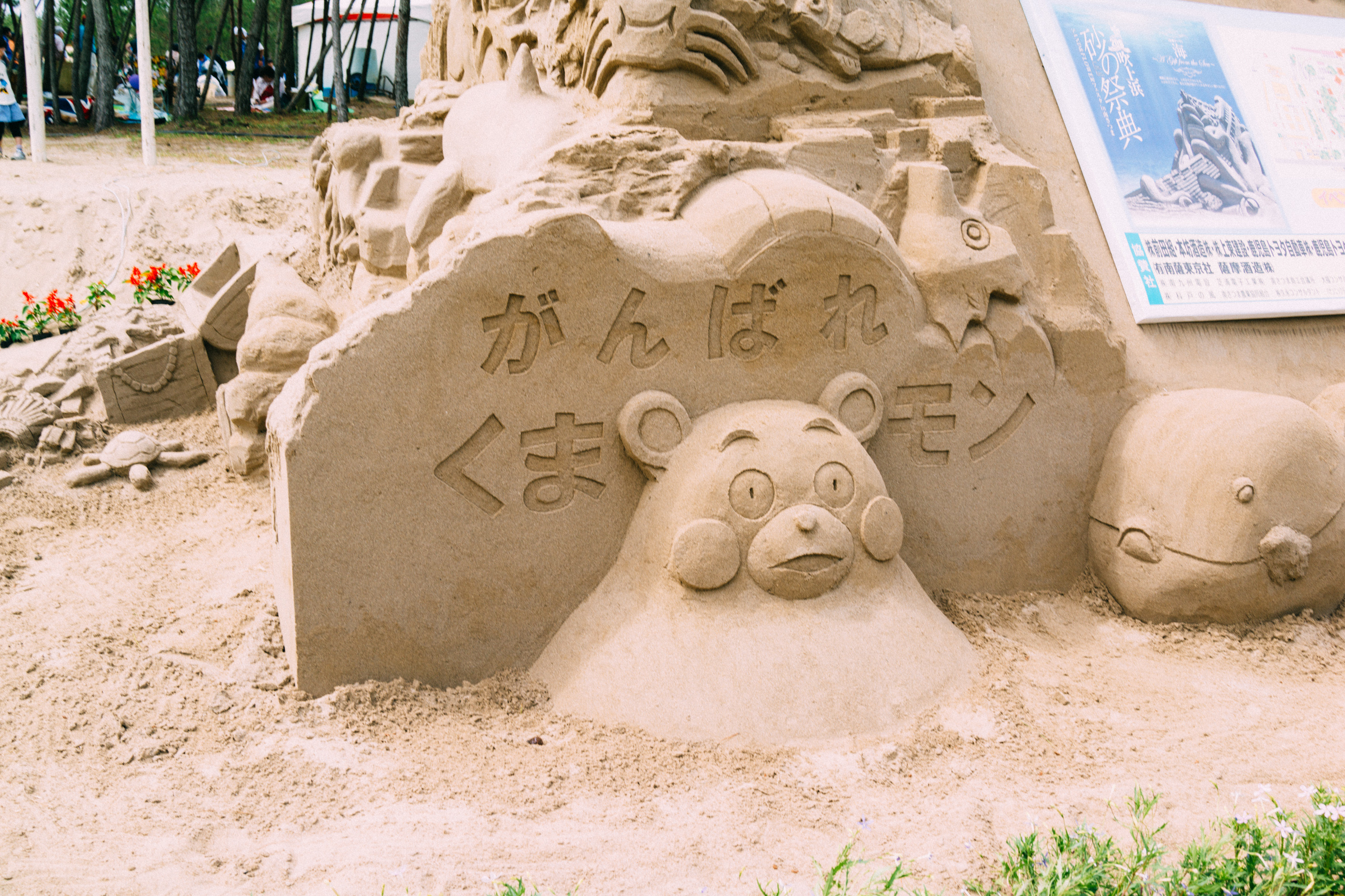 ちょうど熊本で起きた大地震の後だったこともあり、「がんばれ熊本」みたいなプレートが各オブジェに取り付けられていた。なかでも、熊本のゆるキャラを集めた砂のオブジェセットがあり、だいたいのゆるキャラはわかったのだけど、なんだかとても不思議な風景。