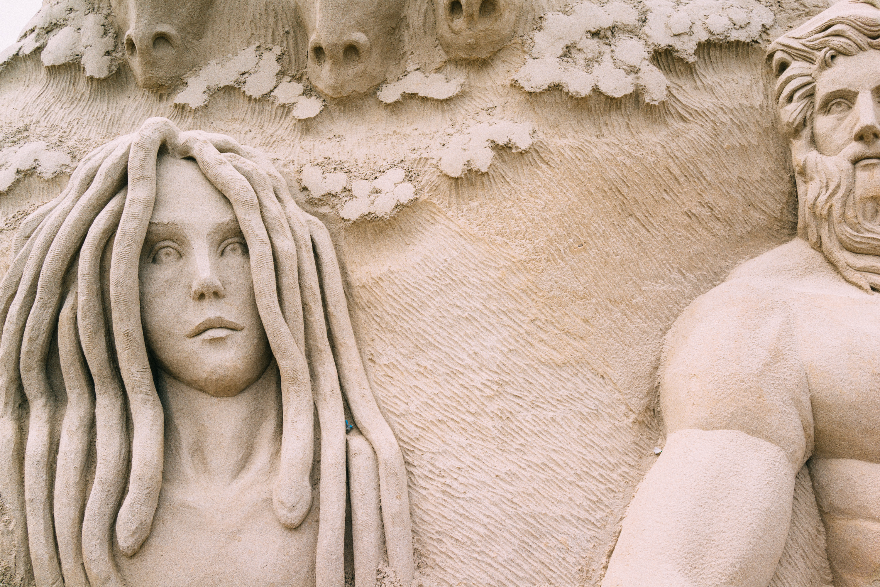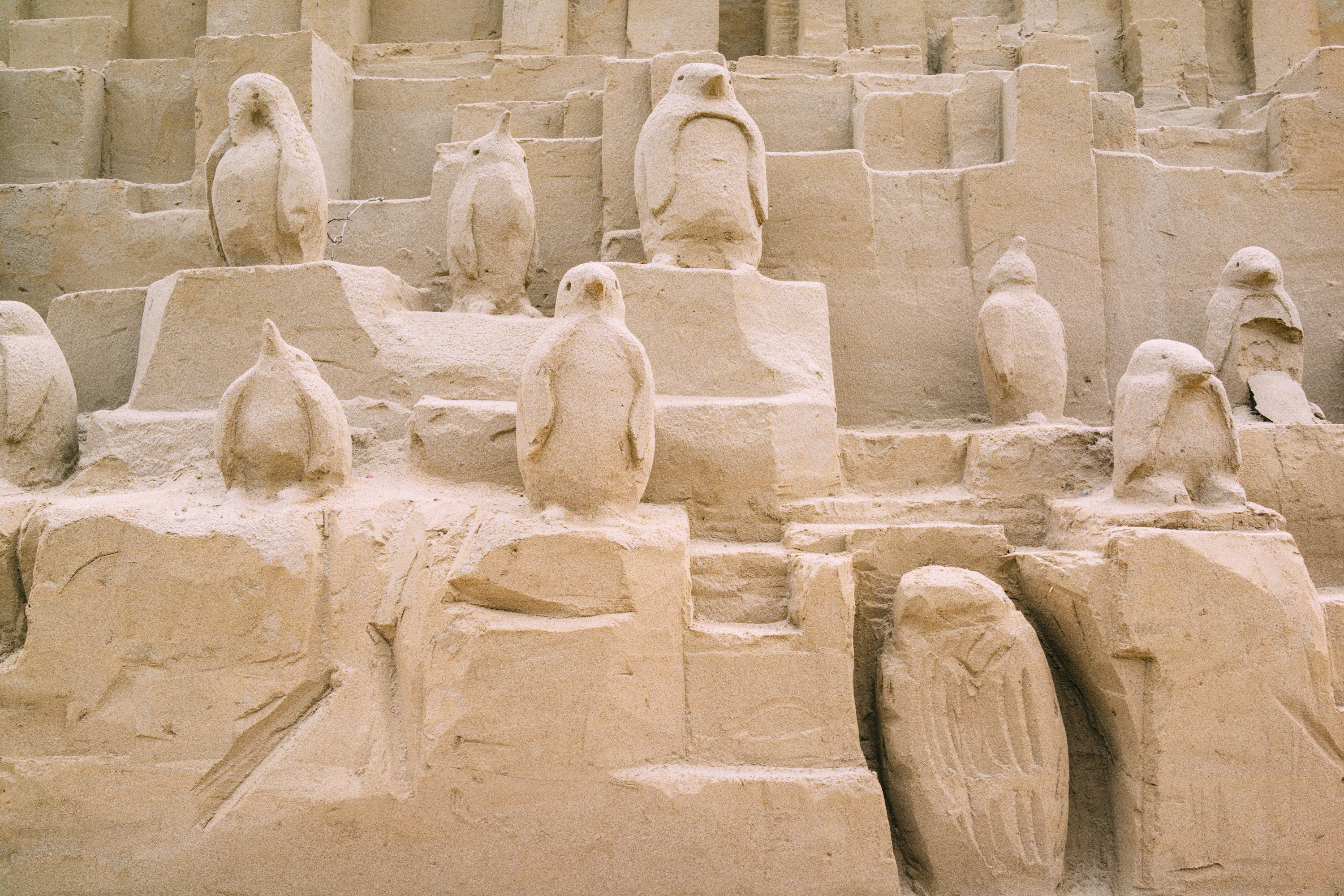 砂のオブジェについては数も多く、なかにはお城のように巨大なものがあったりするので、みていて楽しめる。ちなみに、お城みたいなものの上にある台地では水族館のなかみたいなものがあらわされていて、大量のペンギンが辺りを見回している風景が印象的。というかある意味、圧巻の風景。