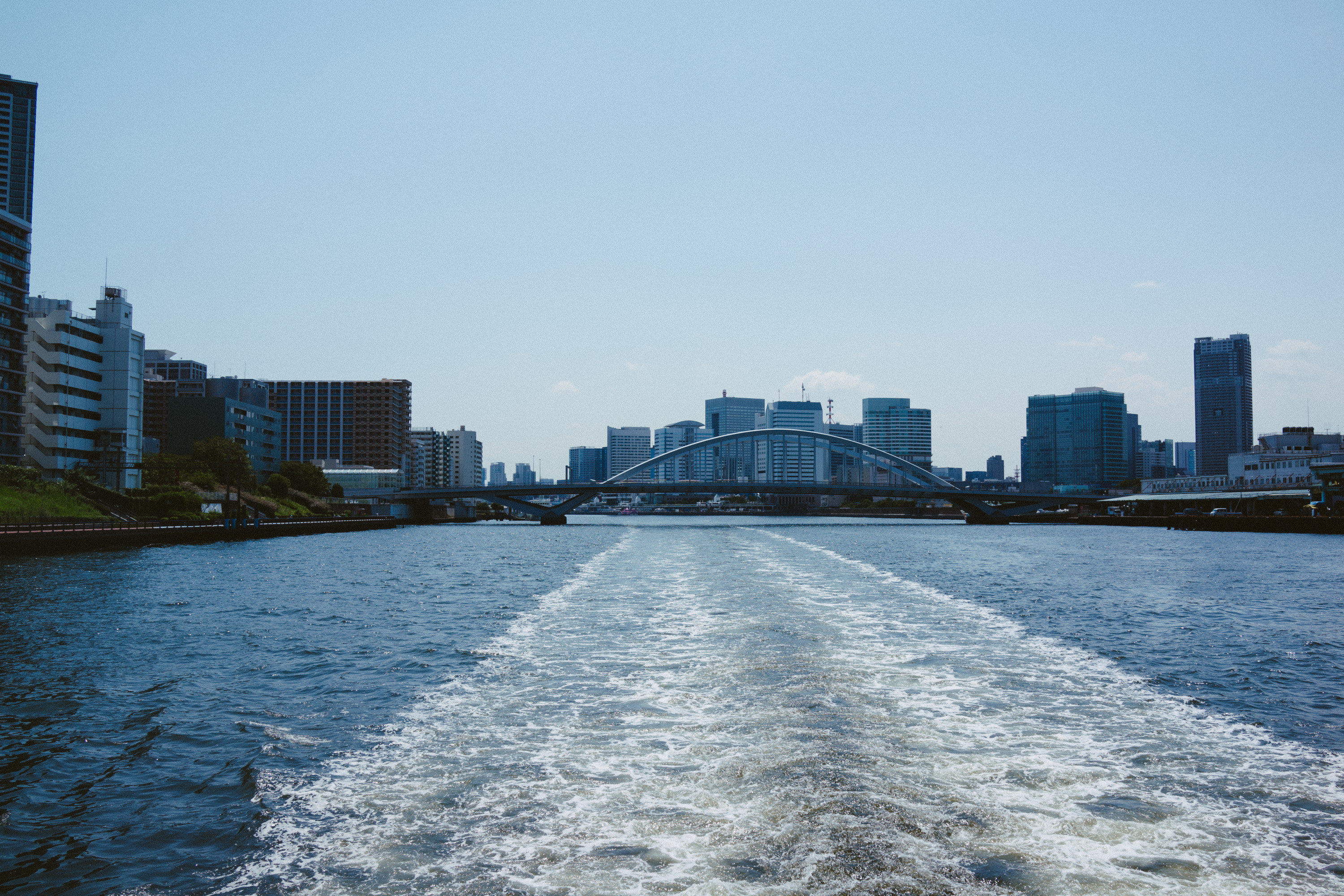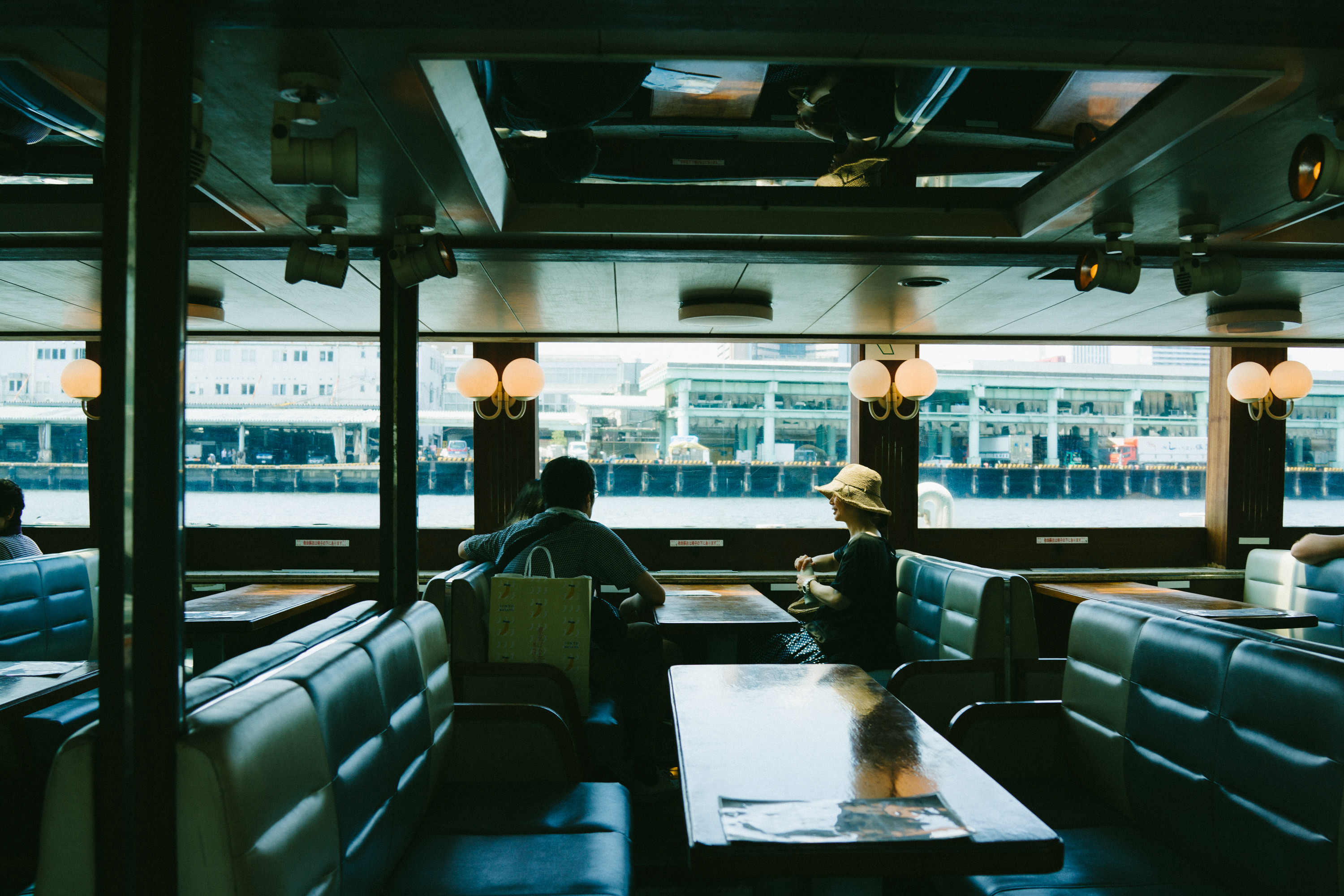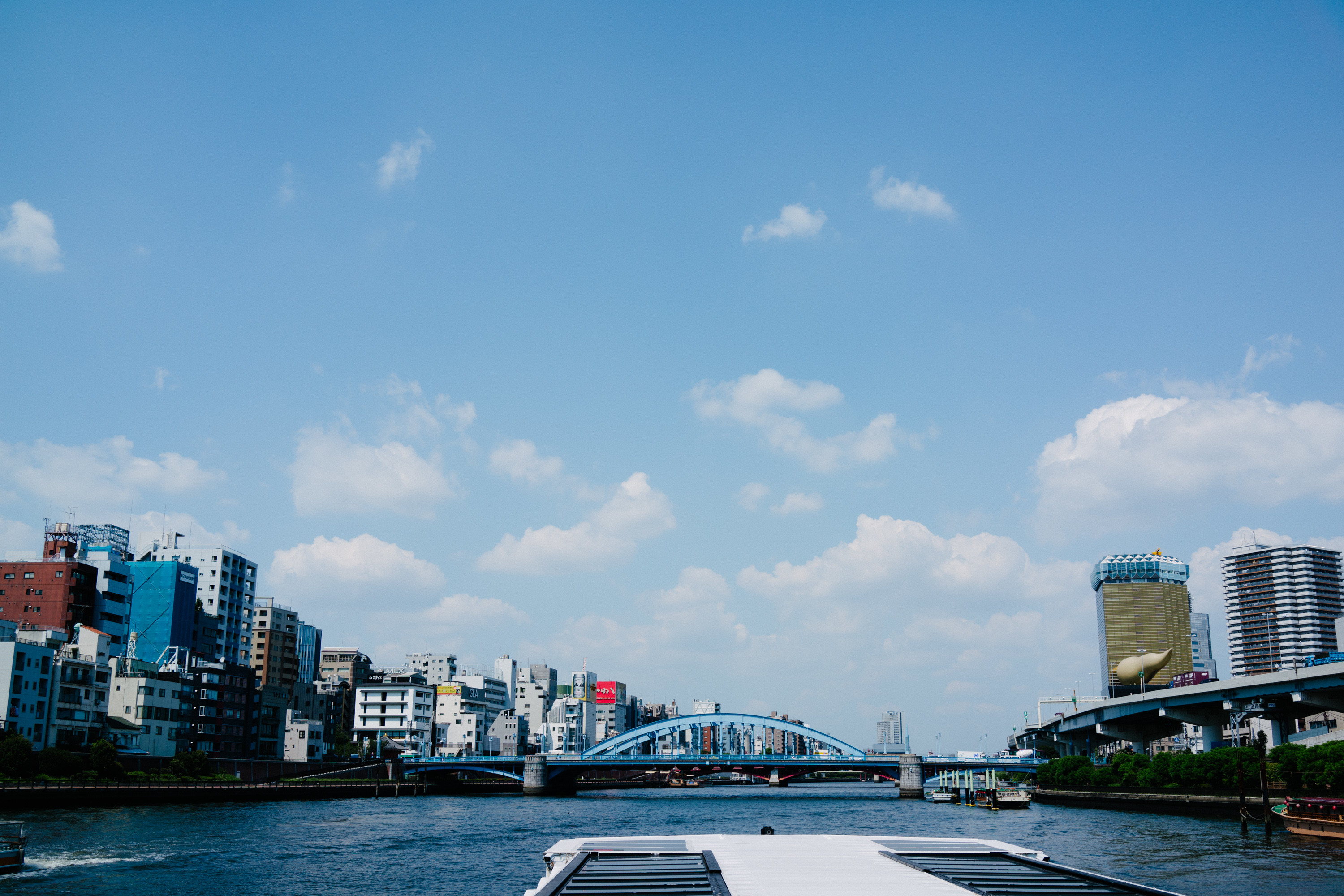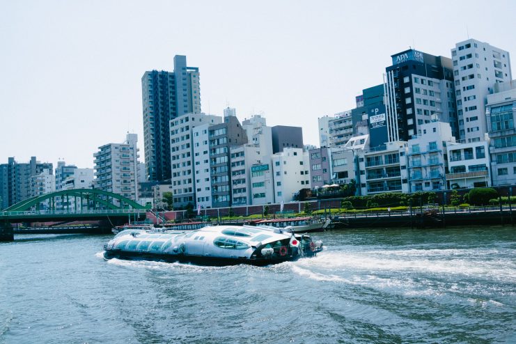 このラインの水上バスは松本零士がデザインしたホタルナとかが人気なのだけど、僕はとくにそこらへんに感慨深い人間でもないのでこだわりなく、来た船に乗りこむことにする。船は二階建てなのだけど、上階は天井がかなり低いので乗っている人はあまりいない。一階席でエアコンの風にふかれてのんびりするか、一番後ろ側にあるテラス席で思い切り太陽の光を浴びながらクルーズを楽しむかの二択ではないかと。僕はあまりの暑さに、迷わず一階席でエアコンの風にふかれること選択。