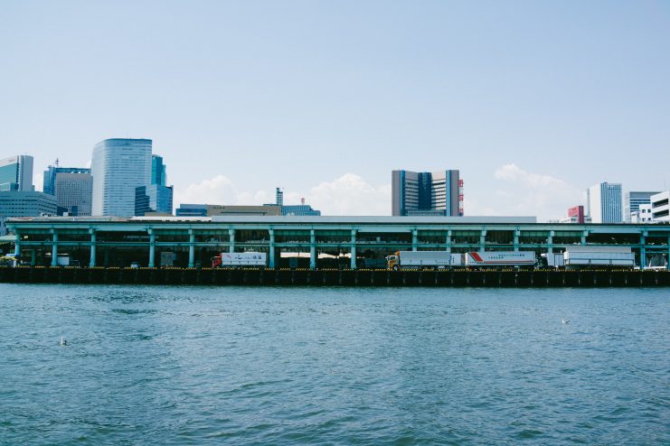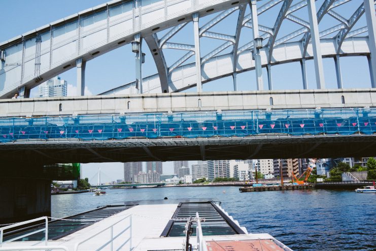 日の出を出航した船は浜離宮から築地市場を通り抜けて隅田川へ入っていく。普段見る景色とは逆の海側からみえる風景は違う場所のように新鮮に感じる。ここから隅田川をさかのぼる間に10個以上の橋をくぐりながら船は進んでいく。これもまた面白い。テラス席にいると、船は橋脚ぎりぎりのところを通り抜けていくので、ちょっとしたアトラクションみたいな感じ。