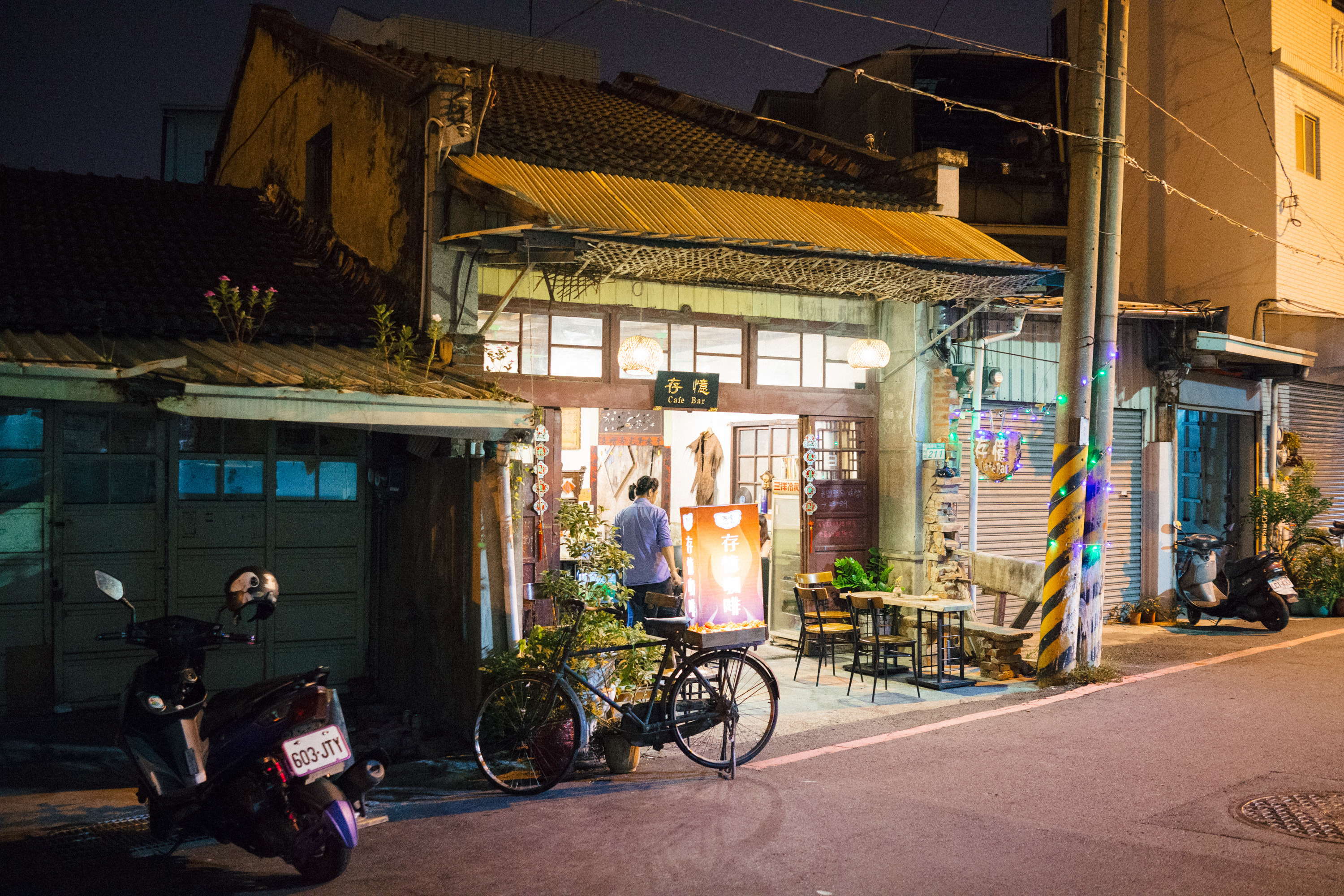 永楽市場のある國華街をさらに北側のあたりを散歩していて偶然みつけたカフェ。夕暮れ時を少し過ぎたくらいで、市場のお店も閉店の準備をしていて、あたりのみんなは帰宅のラッシュみたいなときに、街の中にぽつんとある古民家の風情は駄菓子屋みたいな感じもある。