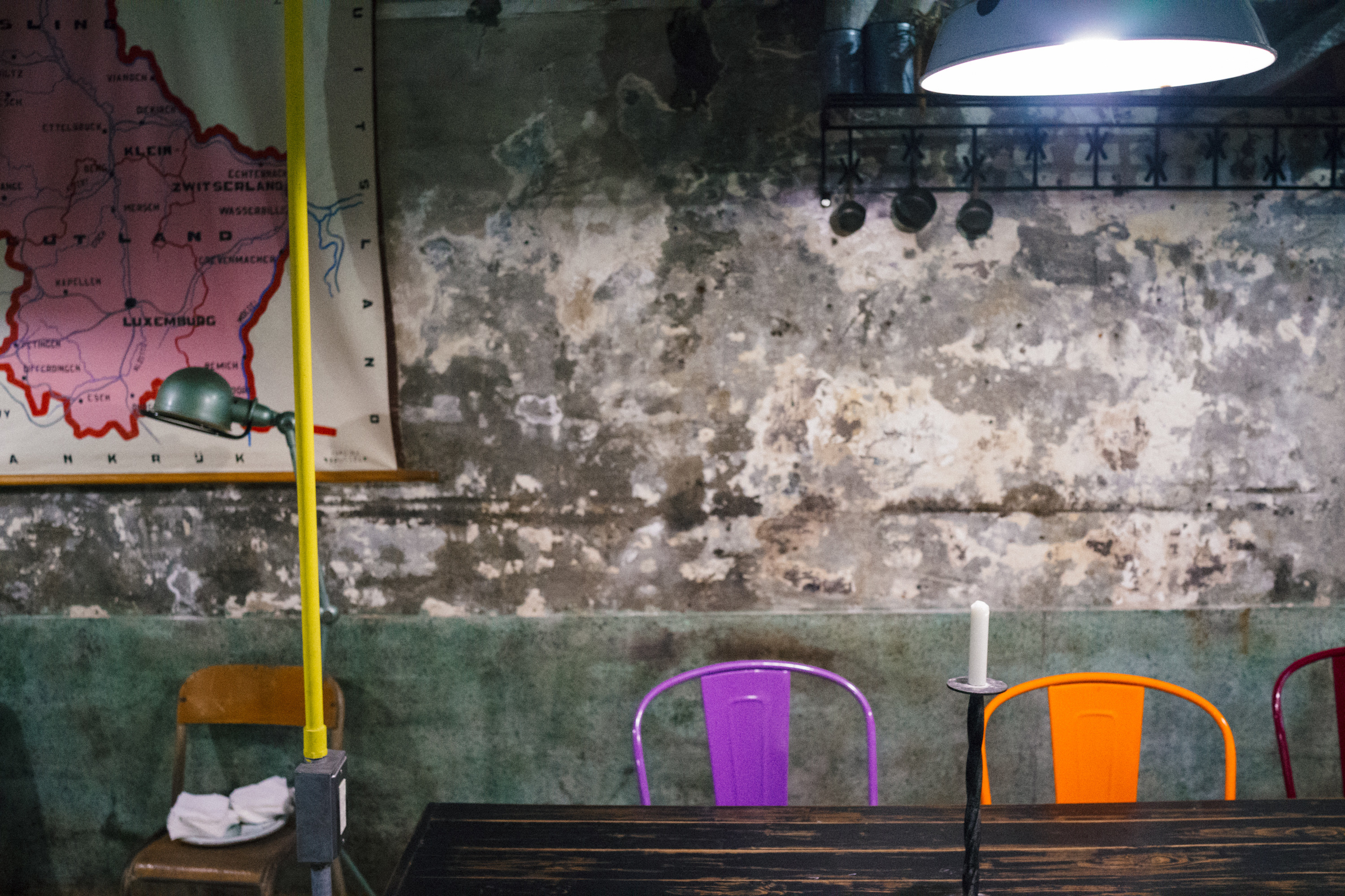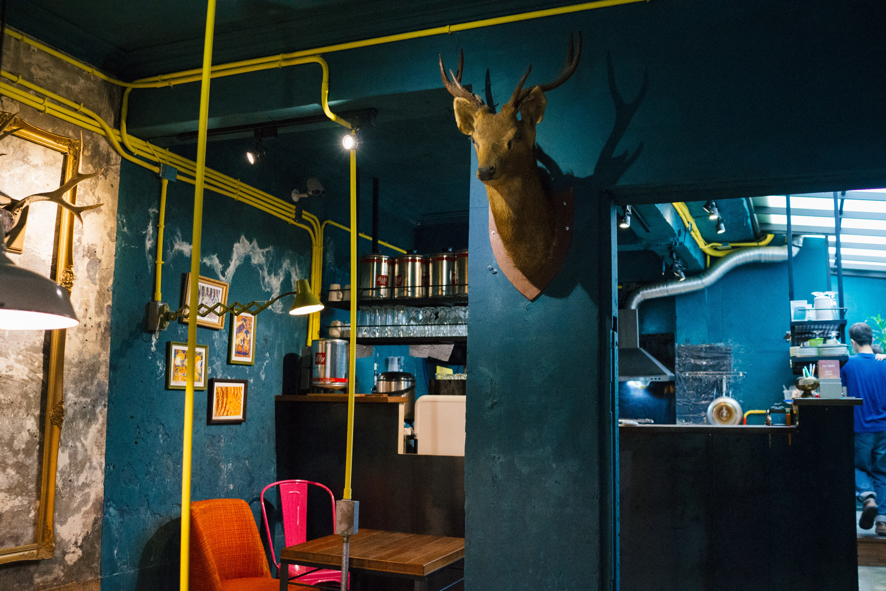 ここもまた古い建物をリノベーションした雰囲気のいいカフェ。入口あたりはガラスの温室みたいになっていて明るい雰囲気だけど、奥の方はコンクリートの壁が向き出して薄暗く、壁にはなぜかルクセンブルグの地図が貼り付けてある。鹿の置物がかけられていたりして、秘密基地みたいだ。