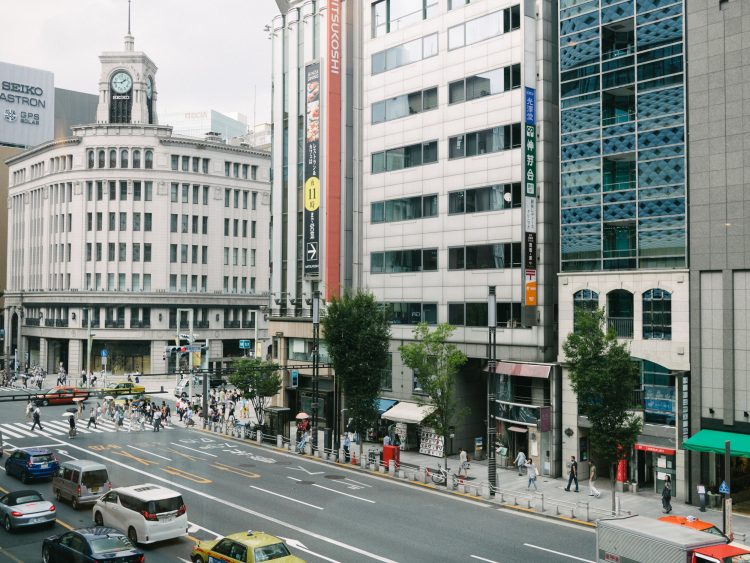 開放的なお店の窓からは銀座四丁目の交差点が望める