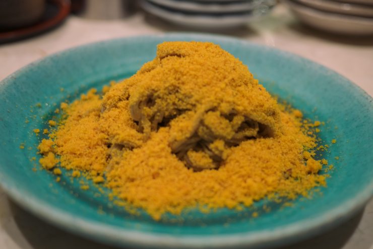 まずはいくつか品切れになる前に頼んでおくことにする。看板メニューは、なんといっても「からすみ蕎麦」だと思う。これでもかと惜しみなく振りかけられたからすみが見た目にも特徴的で、蕎麦と絶妙に絡み合った食感や味の深みは病みつきになる。最初はたいしたことないじゃんとか思うのだが、この味があとで忘れられない印象をもつんだよな。