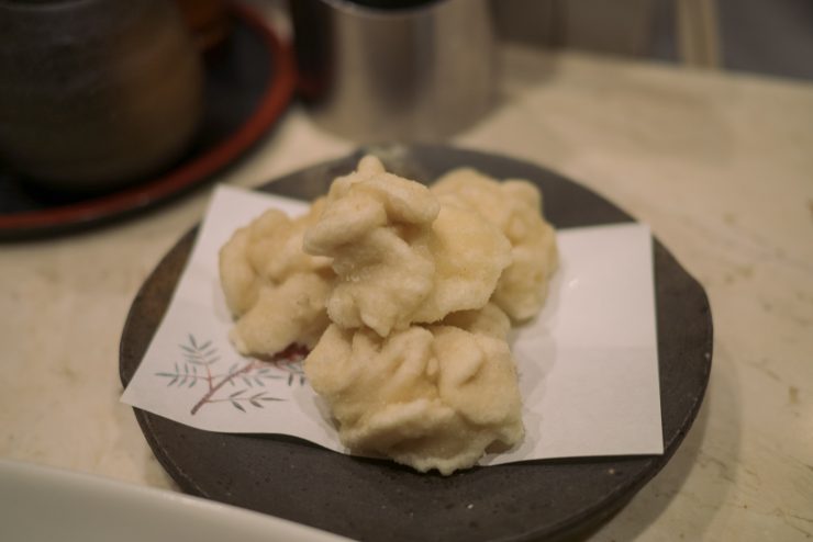 しかし、日本酒もいいのが揃っていて、結構いいやつが気軽にコップに入って出てくるので油断ならない。日本酒あうといえば、白子の天ぷら。白子のとろっとした食感がたまらなく美味しい一品で、幸せな気持ちになる。