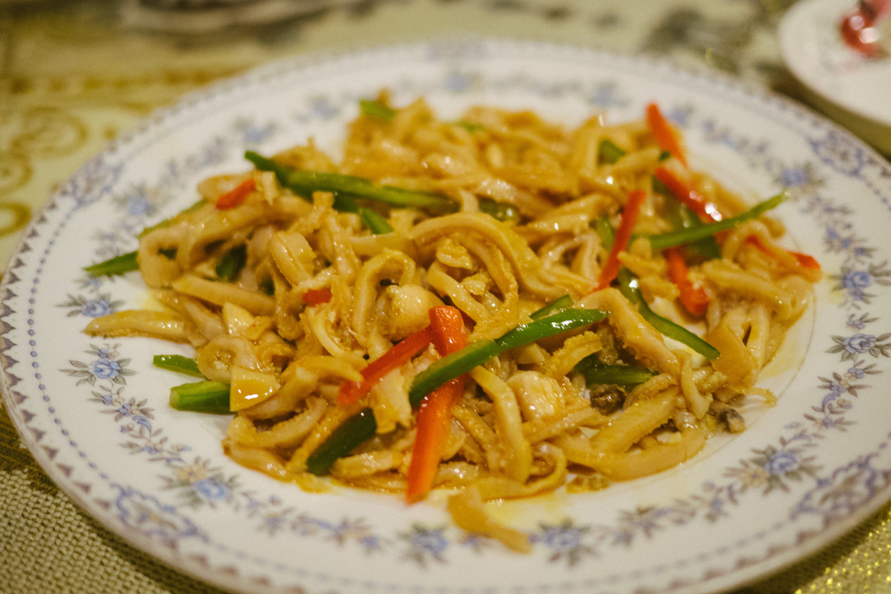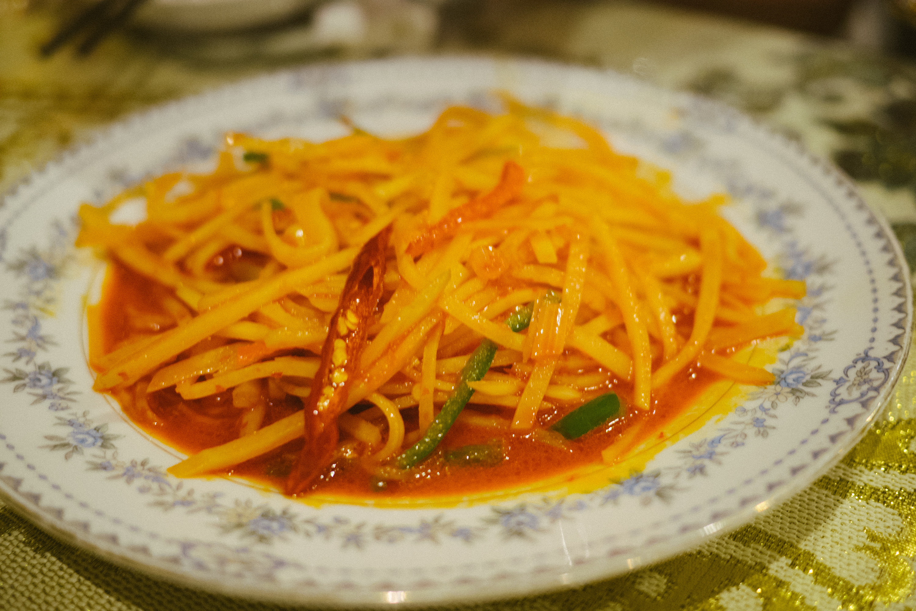 前菜として頼んだのは、羊の胃袋を細切りにして野菜を和えた「ケーリン ハミセイ」というサラダ。羊肉の臭みはなくて、牛のホルモンみたいな感じに近い。辛いのかなと思ったのだけど、そんなことなくて黒酢だろうか、酸味が効いたサラダになっている。