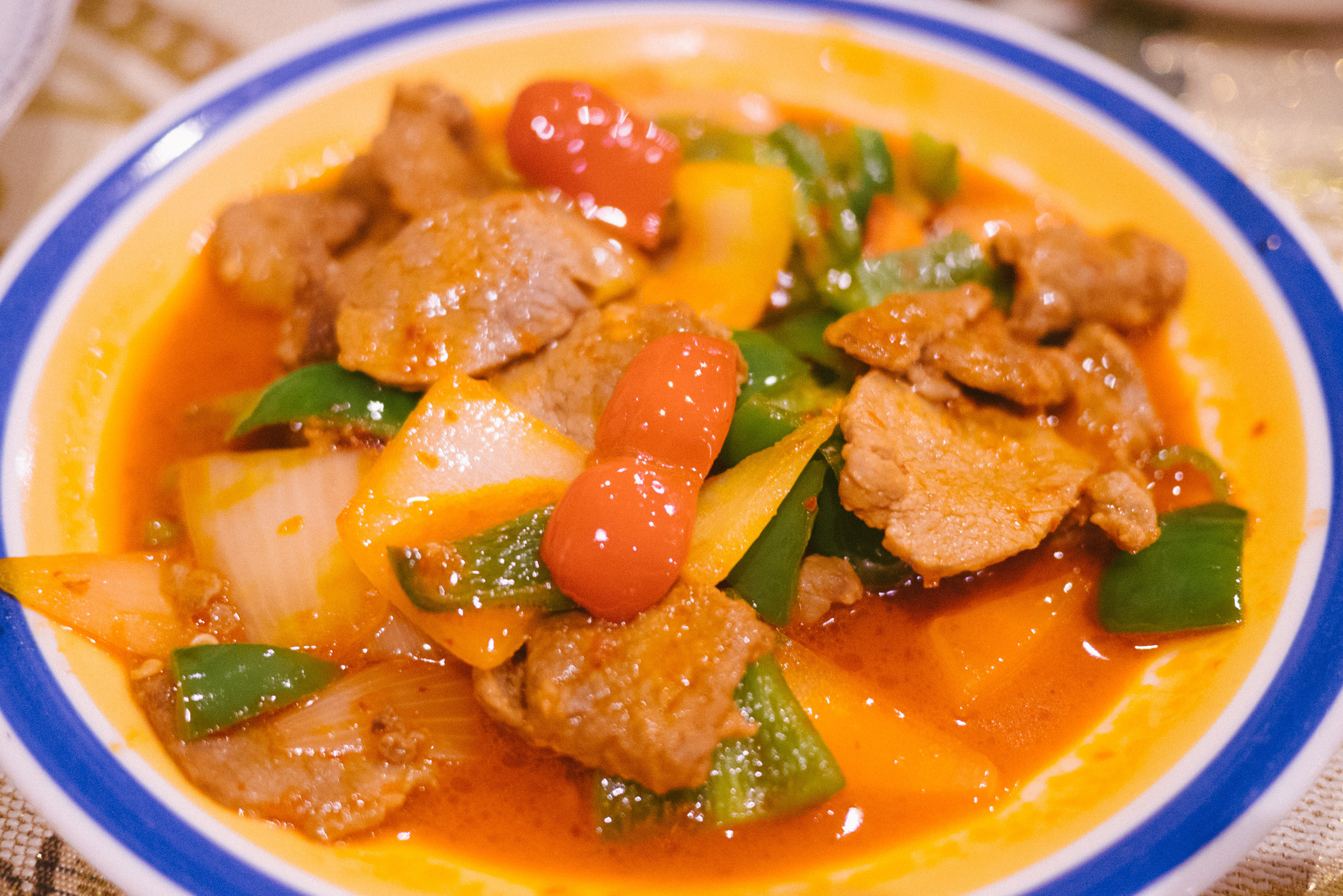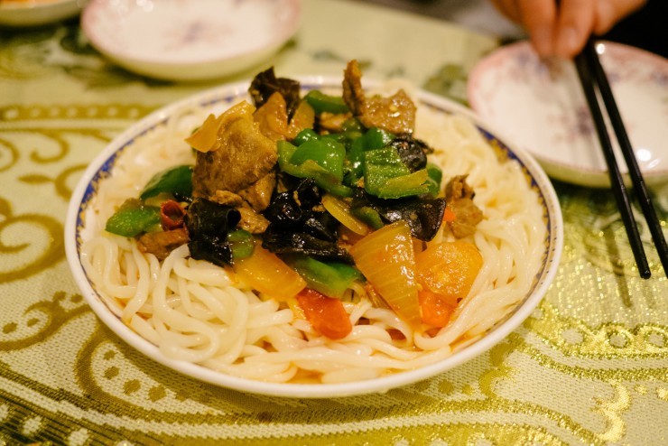 メインとしては「タリム ラグメン」を頼むことにする。ときおり厨房の中から「ばん!」っていう大きな音が聞こえるのだが、それは麺を打ち付けている音で、麺を打ち付ける作業を繰り返すと丸いかたまりから細麺が打ち出されてくるのは見事な手品みたいだ。刃物を使わずに作られた、やや扁平で縮れた感じのする麺は食感とか細打ちのうどんのようでもある。