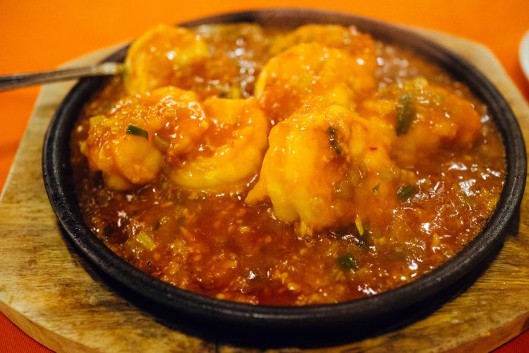 さらにすごいのは鉄板に乗ってきたエビチリをテーブルで料理の仕上げをしてくれるところ。おもむろにナフキンを渡されて「これで、ガードしな」といわれる。そうしたら、店員さんが熱々の鉄板にチリソースをかけるのだけど、この唐辛子の蒸気がかなり強烈でむせ返してしまうくらいだ。もちろん、店員さんは慣れているから大丈夫かと思ったら、結構むせていた。なんだか大変な仕事だな・・。