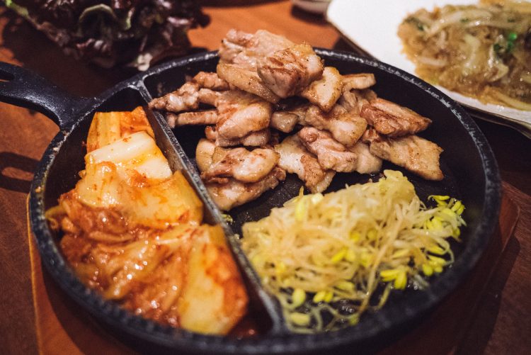 チャプチェ、サムギョプサルやチチヂミといった定番の韓国料理があって、とりあえずあれこれ頼んでみた。チャプチェはちょっと濃いめの深い味付けでついついつまんでしまう美味しさ。値段も手頃なので前菜にぴったりだ。そして、サムギョプサルは焼いてもってきてくれたのだが、それでもこの肉はすごい美味しいって思える。野菜もちゃんとしていて、どんどん食べてしまう。
