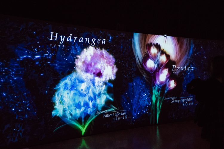 横長の画面が壁のようになっていて、そこを通りすぎると動きに対して花が咲いていくインタラクティブなアートになっている。花の種類はひとつではなく、自分の動きに対してどんな花が咲くのかはそのときのお楽しみになっている。自分の花に対する花言葉も教えてくれる。
