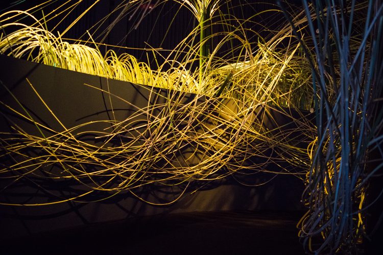 草月流らしい竹を使ったオブジェがすごい圧倒的な迫力の作品。時間がうねって流れるかのような感覚がある。さらに、インスタレーションもあるので端っこの椅子に座って観て楽しみたい。