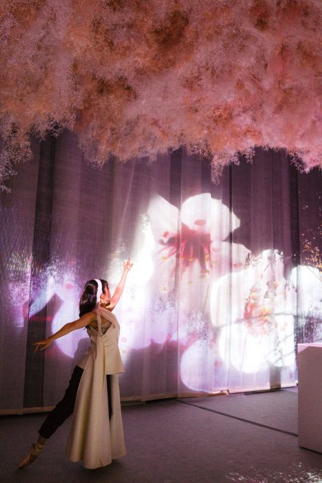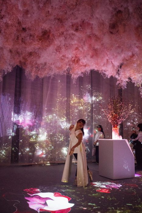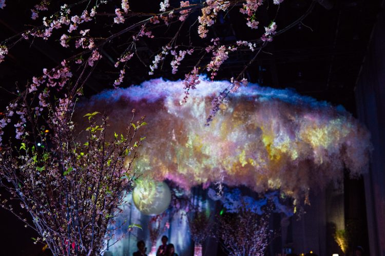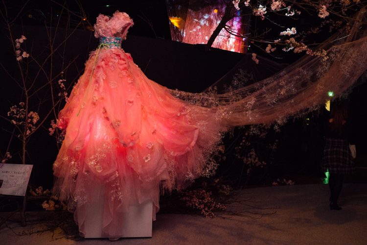 桜の枝に本物そっくりな花がついていたり、頭の上には和紙でできた桜の雲みたいなものがぽっかり浮かんでいる幻想的な空間。隅の方にはバーのカウンターがあって、ここでは桜に関するカクテルなどを楽しんだりすることができる。背景にあるカーテンにはプロジェクションマッピングが動いていて、桜の花びらが舞っている。
