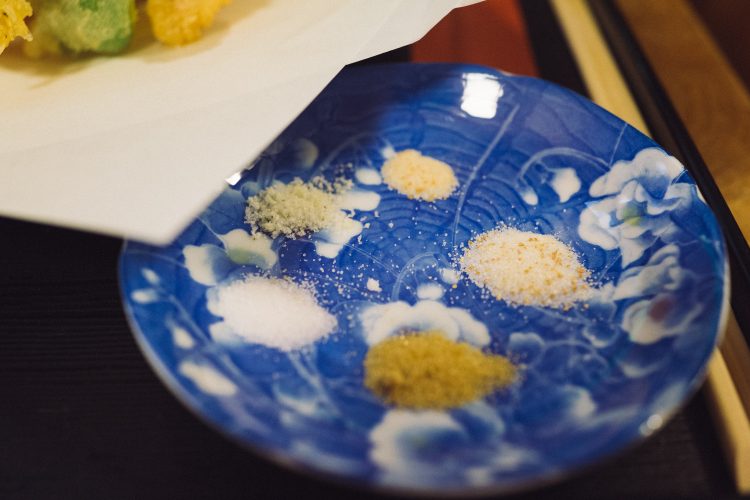 用意されている塩は海老塩、瀬戸内の塩、柚子塩、カレー塩、チーズ塩の五種類。カレー塩はちょっとカジュアル過ぎるところもあるが、これはうまい。