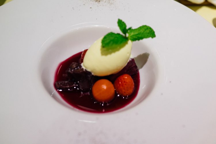 メインは美瑛豚ロースのグリエとなっていて、ル・クルーゼの鍋に入ったままサーヴされてくる。これもまた豪華で美味しい。肉のうまみが充分に引き出されていてワインもすすむ一品だ。ワインについては北海道のワインはあまりそろっていなくて、そこにはこだわらず自分の好きなものを頼んだ方が楽しいと思う。