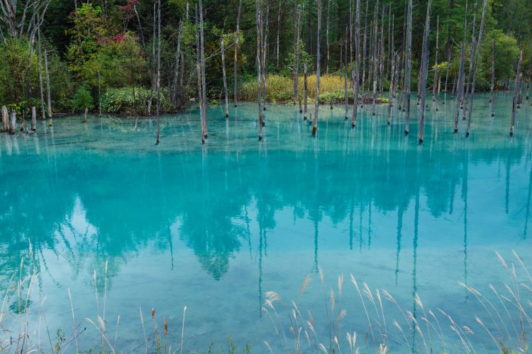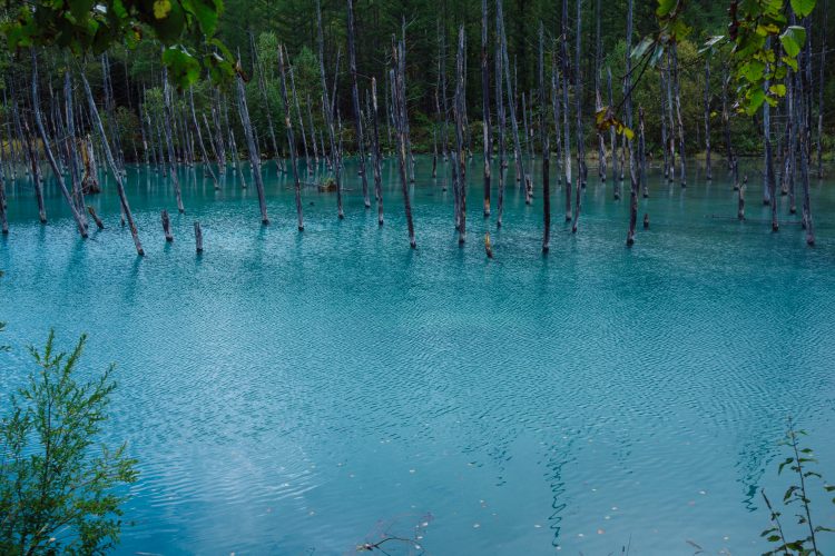 美瑛の絶景「青い池」はお昼くらいに行くのもいいかと思う。