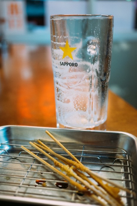 串揚げは豚バラ串、玉ねぎ、チーズちくわ、赤ウインナー、白身魚の串の5本。キャベツはついてこないけれど、この安さだから仕方がない。ビールはしっかり冷えていて美味しい。立ち飲みなので気軽に入れてちょっと一杯とできるのがいいところだ。おかずは5品あれば充分なくらい。