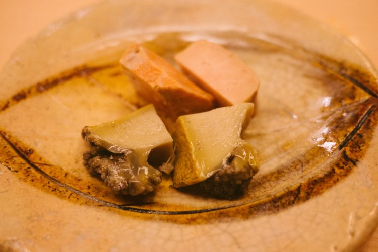 贅沢な感じのアワビが出てきた。こりっとした歯ごたえがあるのだが、固すぎず美味しい。あん肝も濃厚で冬の味覚を堪能できる。