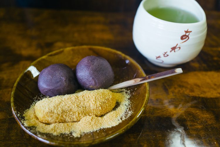 粟餅所 澤屋にて。粟餅の定番、あんこときなこ。お茶が激アツなので注意すること。