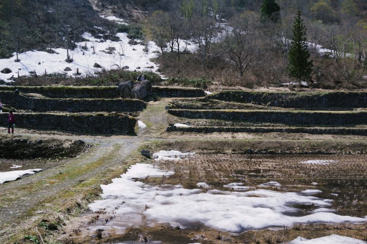 秋山郷は山に囲まれていたり、気候の厳しさから水田はなかったのだが、明治に入ってから飢饉対策として棚田を作り始めたみたいだ。雪解け直後で手入れをしていない田園は神秘的な古代遺跡のようにみえる。この地区を散歩しながらフキノトウをとっていたのだが、なんだかすごく不思議で力強い感覚があった。